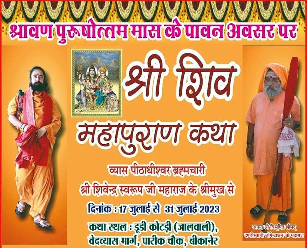 बीकानेर। मायाकुण्ड ऋषिकेश के विद्वान् सन्त ब्रह्मचारी श्रीशिवेंद्रस्वरूपजी महाराज के मुखारविंद से 17 जुलाई से 31 जुलाई 2023 तक पुरुषोत्तम मास के पावन उपलक्ष्य में पन्द्रह दिवसीय शिवमहापुराण कथा का भव्य आयोजन परमार्थ साधक ट्रस्ट द्वारा पारीक चौक स्थित डूडी जी की कोटड़ी में होने जा रहा है। परमार्थ साधक सेवा समिति बीकानेर के मदनमोहन पारीक ने बताया कि शोभायात्रा 17 जुलाई, मंगलवार को सुबह 8 बजे से सत्यनारायणजी मन्दिर, पारीक चौक से कथा स्थल तक जायेगी। पारीक ने बताया कि 15 दिवस तक सामूहिक रुद्राभिषेक सुबह 9:15 बजे किया जाएगा। रविवार को आयोजन संबंधी बैनर का विमोचन किया गया। इस दौरान रूपशंकर पुरोहित, विश्वरतन जोशी दामोदरलाल जोशी, भंवरलाल पारीक, हुकमचंद, कुलदीप सुनील पांडिया, कैलाश पारीक आदि उपस्थित रहे।