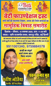 नई दिल्ली। बेटी फाउंडेशन ट्रस्ट द्वारा सभी धर्म की जरूरतमंद दिव्यांग, अनाथ एवं निर्धन कन्याओं के सामूहिक विवाह का समारोह आगामी 16 नवंबर, रविवार को आयोजित होगा। जाने-माने समाजसेवी, रचनात्मक व्यक्तित्व तथा आयोजन के संयोजक पवन कुमार भूत ने बताया कि इस वर्ष राजधानी दिल्ली के छतरपुर मंदिर स्थित ऋषि मारकंडेय भवन में यह आयोजन हो रहा है। उन्होंने बताया की बेटी फाउंडेशन के चेयरमैन सतीश लोहिया के निर्देशन में इस सामूहिक विवाह समारोह का संपूर्ण खर्चा वहन किया जा रहा है। साथ ही उन्होंने बताया कि ऐसे जरूरतमंद परिवार जो अपनी कन्याओं के विवाह का खर्च उठाने में असमर्थ हो वह अपनी सुपुत्री का रिश्ता स्वेच्छा से तय करने के पश्चात पंजीकरण के लिए मोबाइल नंबर 991100 1340 एवं 9759884578 पर संपर्क कर पंजीयन करवा सकते हैं। इस दौरान सभी पंजीकृत एवं सौभाग्यशाली विवाहित जोड़े को शादी के उपरांत बेटी फाउंडेशन द्वारा स्वर्ण, चांदी के आभूषण, वस्त्र एवं घरेलू उपयोग के करीब तीन दर्जन से अधिक प्रकार की सामग्री भी प्रदान की जाएगी।